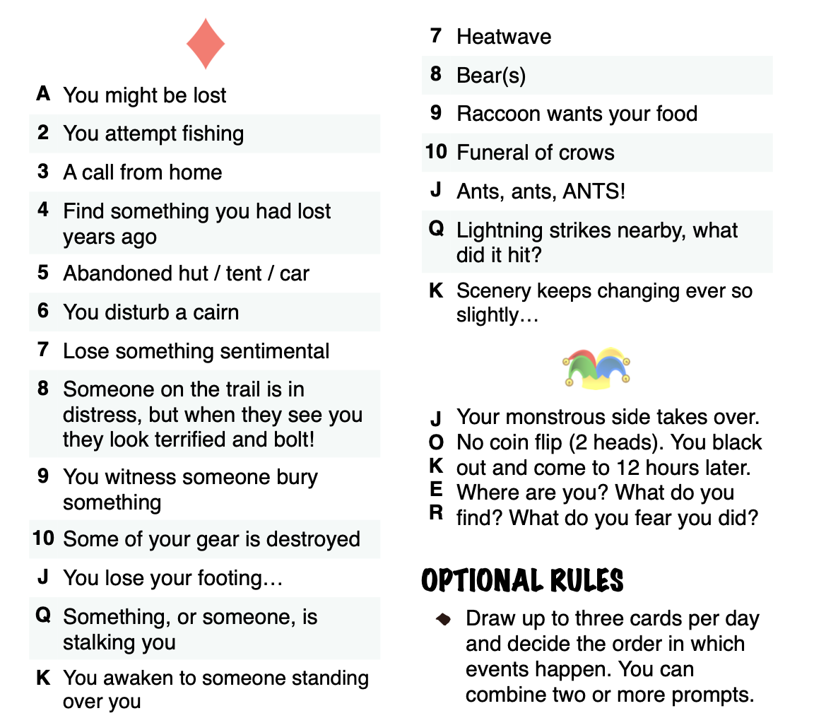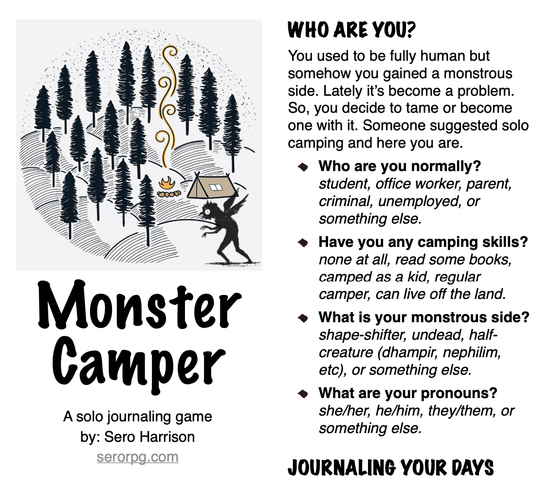 Monster Camper is a solo journaling role-playing game for one person. To play, you will need:
